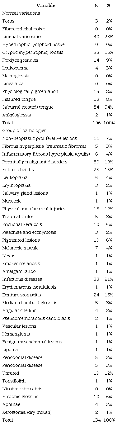 The most prevalent normal variations were saburral tongue (54%), lingual varicose veins (26%), and cryptic tonsils (15%). Pathologies were classified into 10 groups, of which infectious diseases (21%), potentially malignant disorders (PMD) (19%), and physical and chemical injuries (12%) were the most prevalent. Individually, most findings comprised the diagnosis of prosthetic stomatitis (24 cases) comprised. The second- and third-most prevalent diagnoses in this study were actinic cheilitis (23 cases) and frictional keratosis (10 cases) and atrophic glossitis (10 cases), respectively (Table 3).