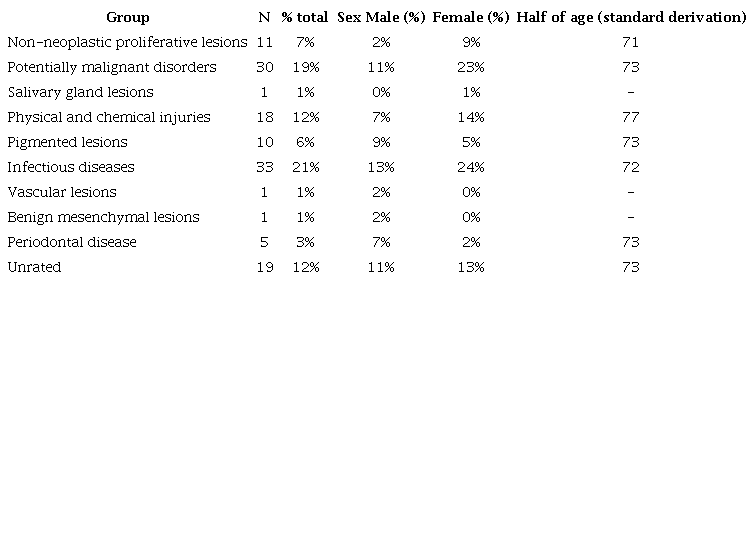 The oral cavity does not escape changes brought on by aging. Many of these changes are manifestations of pathologies such as immunological diseases, hematological disorders, or other diseases such as diabetes mellitus or nutritional deficiencies (4). Other changes may be associated with local factors such as the use of dentures, as frequently found in other studies (4,5). Most oral mucosal lesions are benign, the most common being fibrous hyperplasia (6,7); among malignant tumors, squamous cell carcinoma (SCC) is the most common pathology (8).