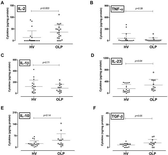 Salivary concentrations of two proinflammatory cytokines, IL-2 (36.5 ± 30.3 vs. 13.4 ± 28.5 pg/mg total protein; p<0.003) and IL-23 (289.50±195.0 vs. 160.2 ± 140.4 pg/mg total protein; p<0.04), were significantly higher in patients with OLP compared to HV (Figure 1.A and Figure 1.D). Salivary levels of the anti-inflammatory cytokine TGF-β were also significantly higher in OLP patients (3.22 ± 2.22 vs. 5.95 ± 4.53 ng/mg total protein; p<0.05; Figure 1.F), but no differences were found for TNF-α, IL-1β, or IL-10 (Figure 1.A, Figure 1.B, and Figure 1.E). There were no diffe- rences in cytokine levels between the subgroups of patients with exclusive reticular OLP and reticular + erosive OLP (data not shown).