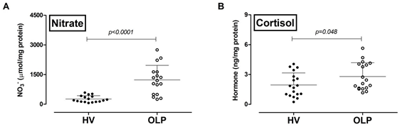 Salivary concentrations of nitrate, the stable metabolite of NO oxidation, were markedly increased in OLP patients (1,227.0 ± 738.8 µM/mg total protein) when compared to HV (261.6 ± 166.8 µM/ mg total protein; p<0.0001; Figure 2.A). Salivary cortisol was also increased in patients with OLP (2.79 ± 1.39 vs. 1.94 ± 1.21 ng/mg total protein; p<0.048; Figure 2.B). As observed for the cytokines, no differences in nitrate or cortisol levels were found when subgroups of the clinical forms were compared (data not shown).