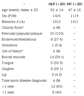 Twenty patients with a clinical and histopathological diagnosis of OLP were recruited. The diagnosis was based on the modified World Health Organization diagnostic criteria proposed by van der Meij and van der Waal (10) and later re-evaluated by the American Academy of Oral and Maxillofacial Pathology (11). Patients diagnosed with any other type of lichenoid lesion were excluded from the study. Moreover, 20 age- and sex-matched healthy volunteers (HV) from the community of our Institution (School of Dentistry of Ribeirão Preto, University of São Paulo - FORP-USP, Ribeirão Preto, Brazil) were included as controls. The patients were selected consecutively by convenience sampling over the period from July 2015 to June 2016. None of these HV exhibited periodontal, systemic, or oral inflammatory diseases during clinical examination. Patients with OLP and HV were nonsmokers and none of them was on continuous medication. Table 1 shows the demographic and clinical characteristics of the subjects, including age, sex, ethnicity, and features of the lesion. The Research Ethics Committee of FORP-USP approved the study (CAAE: 33703114.8.0000.5419) and all patients gave informed consent to participate.