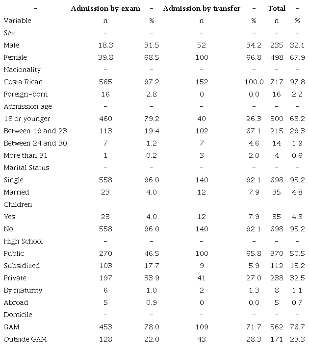 A total of 778 records from the eight years of the study were reviewed, of which 733 with complete data were obtained. Of the students, 97.8% were Costa Rican, with a higher percen- tage of females (68%). Regarding the admission method, 79% entered through the admission exam grade. In terms of age, 68% enrolled at the age of 18 or younger, and 50% came from a public school. Regarding residence, 76.7% were from the GAM. In terms of marital status, 95% were single and remained childless throughout their entire Dentistry program (Table 1).