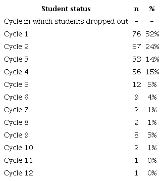 Out of the 12 cycles of the study program of the Degree in Dentistry at the UCR, it is evident that 85% of the dropouts occurred in the first four cycles of the Dentistry program (Table 2).