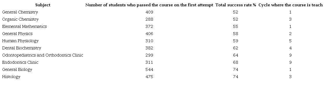 A study published in 2009 indicates that, on average, dentistry students at UCR take two years longer to graduate than the established duration of the curriculum, mainly due to high failure rates, especially in some service courses. Among these service courses, the ones with the highest failure rates are General Chemistry with 41%, Medical Physics with 39%, and Dental Biochemistry with 43%. As for the core courses of the program, from 2004 to 2007, the Dental Anatomy course had a failure rate of 13%, and from 2005 to 2007, the Pediatric Dentistry Clinic had a failure rate of 25% (10). Since that publication, no further studies have been conducted to determine whether the mentioned courses continue to generate high failure rates or if other courses are currently facing this situation. As a result, the objective of this research was to identify the failure rates of the courses in the Dentistry curriculum at UCR from the cohorts of 2007 to 2014.