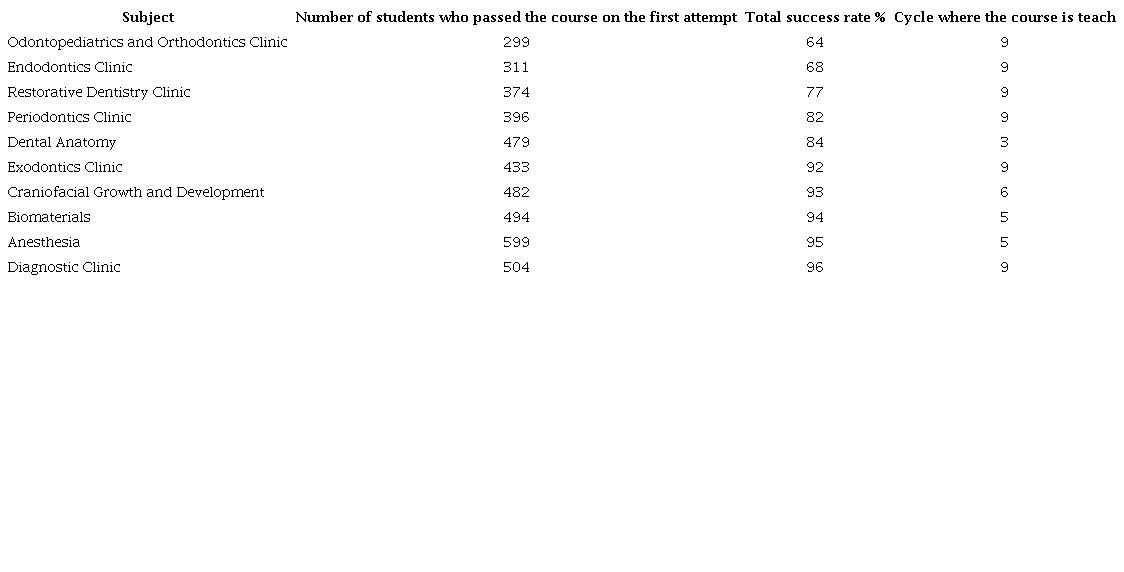 Regarding the courses offered by the Faculty of Dentistry, the clinical courses in the fifth year (cycles 9 and 10) of the program were among the 10 courses with the lowest overall success rates. The two clinics with the lowest percentage of overall success were as follows: in second place was the Endodontics Clinic (68%), and in the first place was the Pediatric Dentistry and Orthodontics Clinic (64%), which was the course most frequently enrolled in by a student, totaling eight times, followed by the Anesthesia course and the Endodontics Clinic, which a student enrolled in up to five times (Table 4).