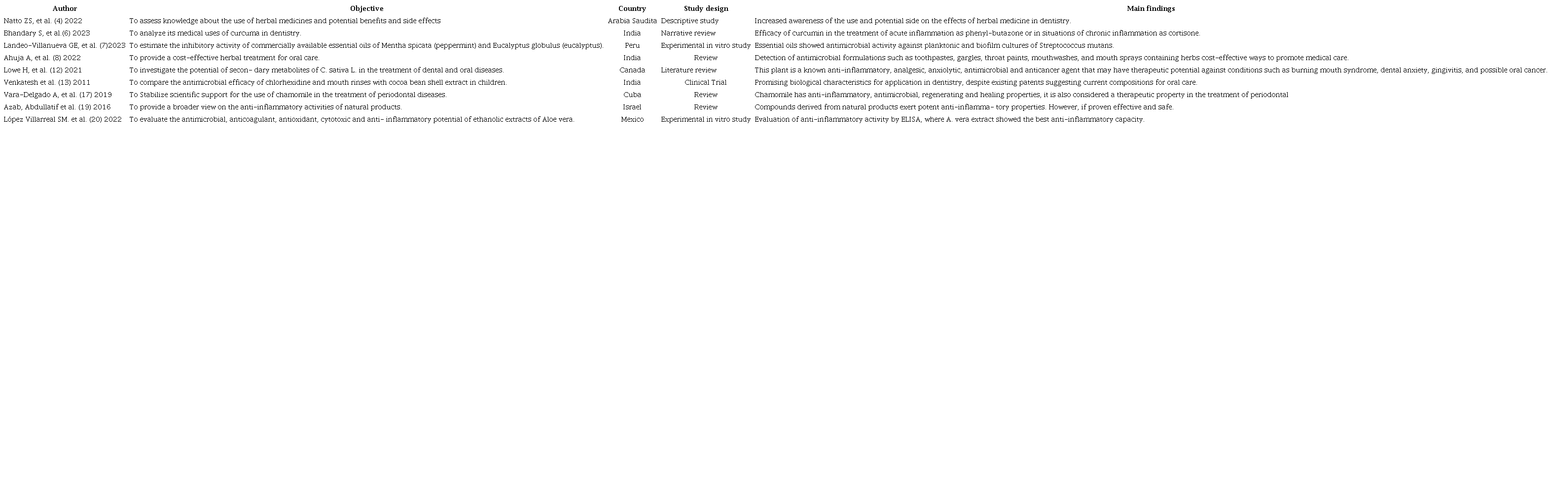 The results of the reviewed studies were classified and presented in 3 main parts: antiinflammatory, antimicrobial and wound healing plants. The overview of the main characteristics, materials used, and designs of the reviewed studies are reported in Table 1.