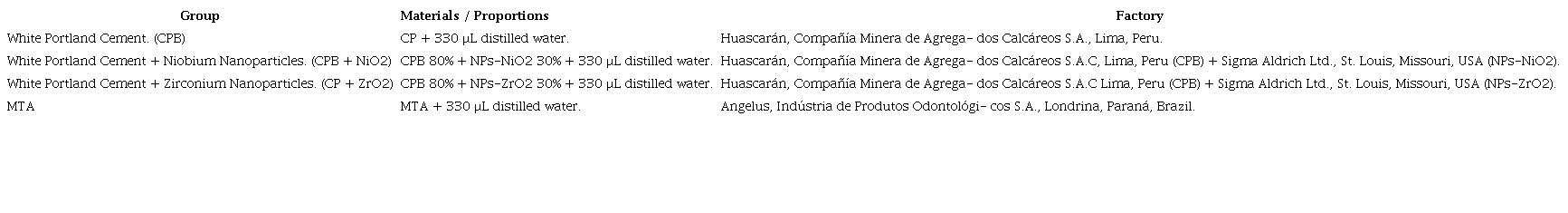 The available studies by Tanomaru and Duarte on the use of Portland cement as a potential matrix in the area of biomaterials due to its chemical composition of dicalcium silicate, (12, 16) but on the incorporation of nanoparticulate agents of niobium oxide (NiO2) and zirconium oxide (ZrO2) are scarce in relation to their concentrations and particle size and their relationship with different properties; it is necessary to seek the optimization of these cements.