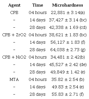 Table 2 presents the mean and standard deviation of the surface microhardness values of calcium silicate cements associated with NiO2 and ZrO2 nanoparticles. CPB + ZrO2 had the highest hardness value (p<0.05) followed by CPB + NiO2 and MTA control cement. The lowest value of surface microhardness (p<0.05) was observed by the MTA in the evaluation periods. Surface micro- hardness values were significantly higher at 28 days than at 04 hours for all groups evaluated.