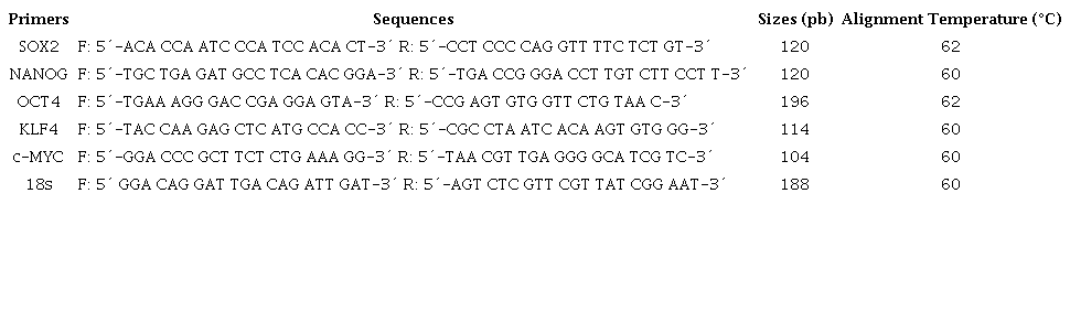 To determine the differentiation capacity of PLSCs, the expression of embryonic stem cell markers was determined by PCR (NANOG, SOX2, OCT4, KLF4, c-MYC), and constitutive gene 18s, and the markers for MSCs, both positive (CD73, CD90, and CD105) and negative (CD34 and CD45), by flow cytometry.