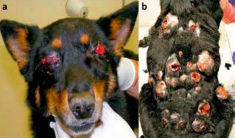 Localization and aspect of the nodules observed on dog. Diseminated granulomatous tissue on eyelids with corneal opacity (a). Ulcerated nodules with purulent fluid on toracolumbar zone (b).