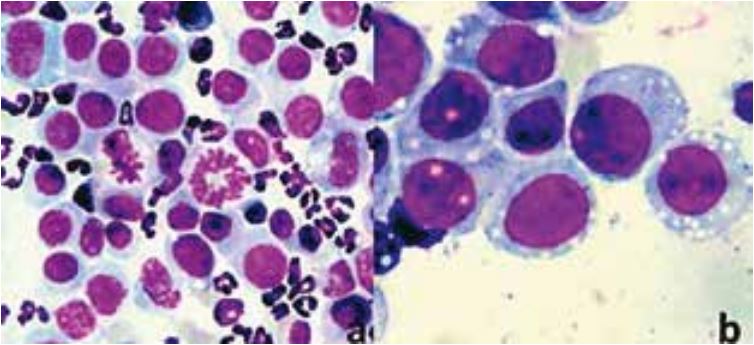 Citological exam of the CTVT with skin nodules (a,400x) and penis mass (b,1000x). It is possible to observe anisocariosis, prominent nucleus and nucleolus with lacking basophil cytoplasm. Multiple vacuoles and mitotical figures are observed. Abundant polymorphonuclear neutrophils are observed, especially in cutaneous nodules. Giemsa stain.