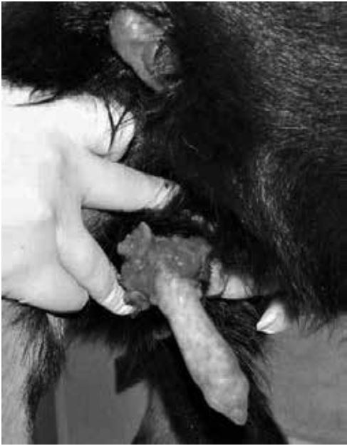 Sobre la base de los hallazgos citológicos se realizó un examen de genitales, no realizado anteriormente por el evidente compromiso cutáneo. En la base del pene se observó una masa granulosa firme y bien delimitada (figura 3) con características citológicas similares a las masas de piel y párpados. El prepucio no presentaba lesiones.