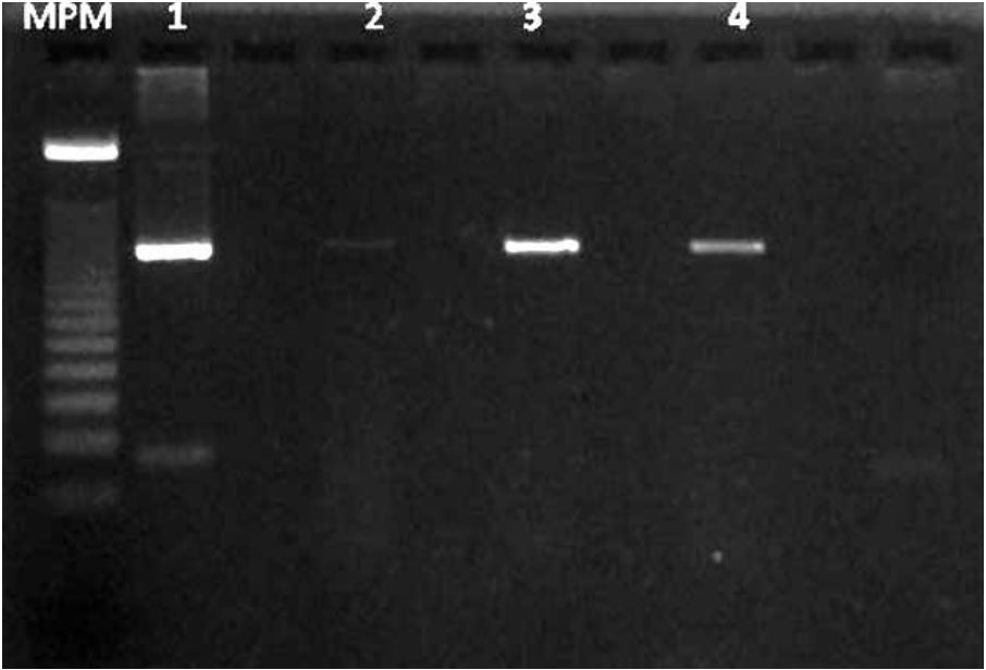 PCR reaction in CTVT samples from penis, eyelids and skin. The image shows LINE-1 insertion in oncogene c-myc. Line 0: Molecular weight marker (MPM), line 1: Positive control, line 2: penis, line 3: skin, line 4: eyelids.
