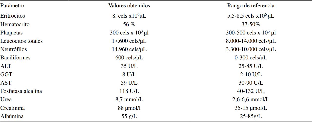 El análisis hematológico demostró la presencia de leucocitosis con neutrofila con desvío a la izquierda regenerativa y aumento relativo del hematocrito, ya que el número de eritrocitos se mantuvo dentro del rango (cuadro 1). Los parámetros bioquímicos analizados como ALT, GGT, fosfatasa alcalina, AST, urea, creatinina y albúmina se encontraban en rangos de normalidad (cuadro 1).