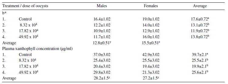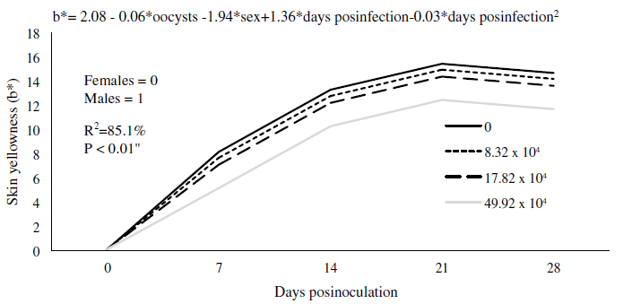 Between 0 and 28 d posinoculation (21 and 49 d of age), for every d that pigment was consumed, skin yellowness was increased by 1.36b* for both males and females. However, the rate of skin pigmentation was greater in female birds (1.94b*). For every 10,000 SEO that birds received, skin pigmentation decreased by 0.06b* (figure 1). This relation- ship can be described by the following equation: b*= 2.08- 0.06*oocysts - 1.94*sex + 1.36*d post-infection - 0.03*d post-infection2; R2=85.1%; P < 0.01. Skin yellowness (SY) in live birds at 49 d of age was significantly greater (P < 0.05) in the control group (17.6b*) with respect to treatments 2, 3, and 4 (13.07, 11.9 y 13.8 b*). SY in males was significantly lower than in females (12.8 b* and 15.5 b*, respectively) (P < 0.05) (table 2).