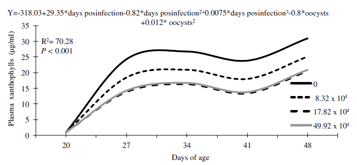 Concentration of PX was reduced by 0.8 µg/ml for every 10,000 SEO given to each bird. (figure 2). The effect of coccidia inoculation on PX concentration can be explained by the following equation: Y=-318.03+29.35*DI- 0.82*DI2+0.0075*DI3-0.8*oei+0.012* SOE2; R2=70.28: P < 0.001, in which Y = PX concentration; DI = d post-infection; SEO = sporulated Eimeria spp. oocysts inoculated. Results for PX concentration are presented in table 2. Birds from the unchallenged control treatment had significantly greater PX concentration (39.7 µg/ml) compared to the challenged treatments (25.5, 19.9 and 25.6 µg/ml respectively). Sex had no significant effect on PX concentration, and there were no interactions between treatments (P < 0.05).