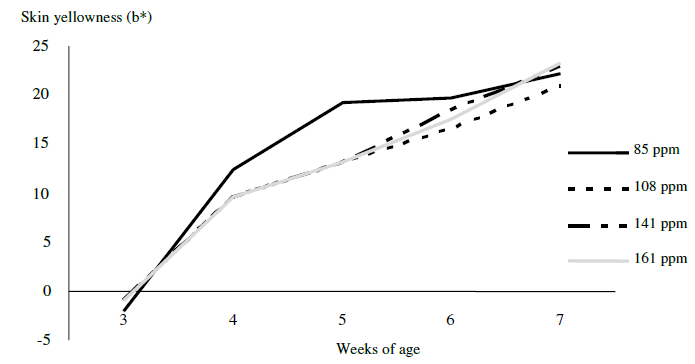 Starting at 21 d, and then weekly for the duration of the study, skin yellowness units (b*) were determined in the right lateral apterial area of 10 birds/pen, using a reflectance colorimeter (Model CR-400, Minolta Corp., Ramsay, NJ.) (Muñoz-Díaz et al 2012).