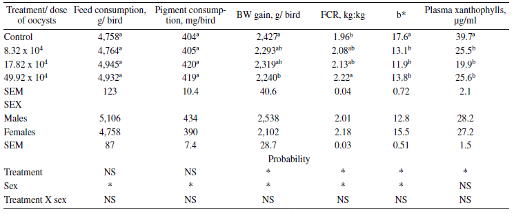 In Experiment 1, from 21 to 49 d of age, BWG in birds from the control group (2,427 g) was significantly greater than in birds from treatment 4 (2,239 g), which was challenged with the highest coccidia dose (P < 0.05). The best FCR was observed in the birds from the control treatment (1.96 kg:kg), which was significantly better from that observed in the treatment with the highest coccidia challenge (2.22 kg:kg). As expected, there was a significant effect of sex on growth performance. In males, BWG (2,538 g), feed consumption (5,110g) and pigment consumption (434mg) were significantly greater than in females (2,102 g, 4,589 g, 390 mg, respectively), while FCR was better in males (2.01 kg:kg) when compared to the females (2.18 kg:kg) (table 1).