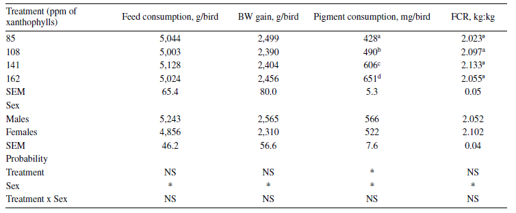 Growth performance was not significantly different between treatments at 49 d of age. However, males had significantly higher feed consumption (5,243 g), BWG (2,565 g), and better FCR (2.05 kg:kg) than females (4,856 g, 2,310 g, and 2.1 kg:kg, respectively) (P < 0.05). Pigment consumption was significantly greater in the males, and it differed across treatments according to the level of dietary XA. Birds from treatments 2, 3, and 4 received higher concentration of dietary XA from 35 to 49 d of age, and their XA consumption was 62, 178, and 223 mg per bird greater than that observed in the birds from the control treatment (table 3).