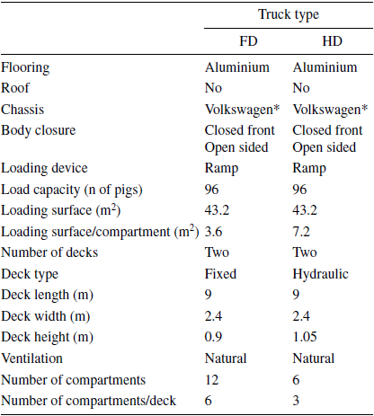 In this study, the two trucks and drivers were the same on each journey (9 journeys) to the slaughter plant. The trucks (Triel-HT, Erechim, Brazil) were of double-decked type either featuring a fixed or a hydraulic upper deck (FD and HD, respectively). A technical description of both trucks is presented in table 1. In both trucks pigs were transported for 118 min (± 37) at a density of 230 kg/m2. In the FD truck pigs were distributed into 12 compartments (6 per deck) holding 8 pigs each, while in HD truck pigs were transported in 6 compartments (3 per deck) holding 16 pigs each.