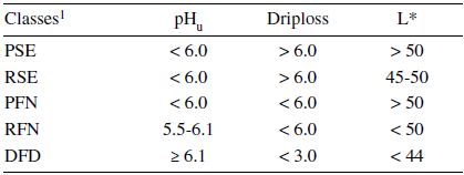 1 PSE: pale, soft and exudative; RSE: red, soft and exudative; PFN: Pale, Firm, non-exudative; RFN: red, firm and non-exudative; DFD: dark, firm and dry.