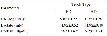 Except for blood cortisol levels, truck type had no effect on the other blood stress parameters assessed in this study (P > 0.05; table 3). Pigs transported on the HD truck showed lower (P < 0.05) blood cortisol levels than those located on the FD truck. Reduced exsanguination blood cortisol levels in pigs handled using hydraulic systems compared with ramps were previously reported by Ludtke et al (2012) and Weschenfelder et al (2012) and would indicate that incomplete recovery from the psychological stress of negotiating a ramp in FD pigs.