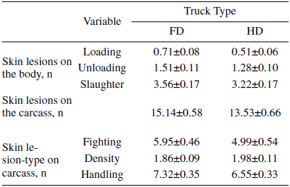 1 Mean values and standard deviation.2 CK: Creatine kinase.a,b Means lacking a common superscript differ (P < 0.05).However, similarly to previous studies (Nanni Costa et al 1999, Weschenfelder et al 2012, 2013, Correa et al 2013), in this study loading and unloading pigs using an hydraulic system did not influence skin lesions in neither live pigs nor carcasses (P > 0.05; table 4). Since a higher number of pigs in one compartment increases the probability of contacts between pigs, there could be an effect of truck type on the incidence of pigs with skin lesions at unloading and on the number of carcass lesions. However, when the density is within the guidelines of the EU, the group size effect is not significant. These results may indicate that when pigs are handled gently in small groups using proper handling tools, the impact of loading/unloading equipment in the truck on skin lesions is not important.