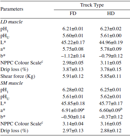 1 Mean values and standard deviation.a,b Means lacking a common superscript differ (P < 0.05).c Based on NPPC colour standards from 1 (pale) to 6 (dark) (NPPC 1999).