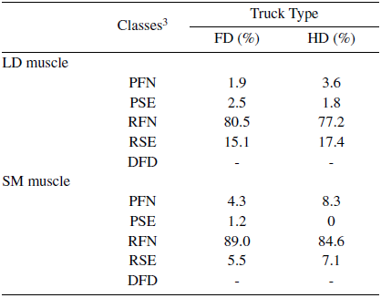 Clasificacion1 de la calidad de carne de acuerdo con efecto del tipo de camion (FD o piso superior fijo vs. HD o piso hidraulico) evaluados en el musculos2Longissimus dorsi (LD) y Semimenbranosus (SM).