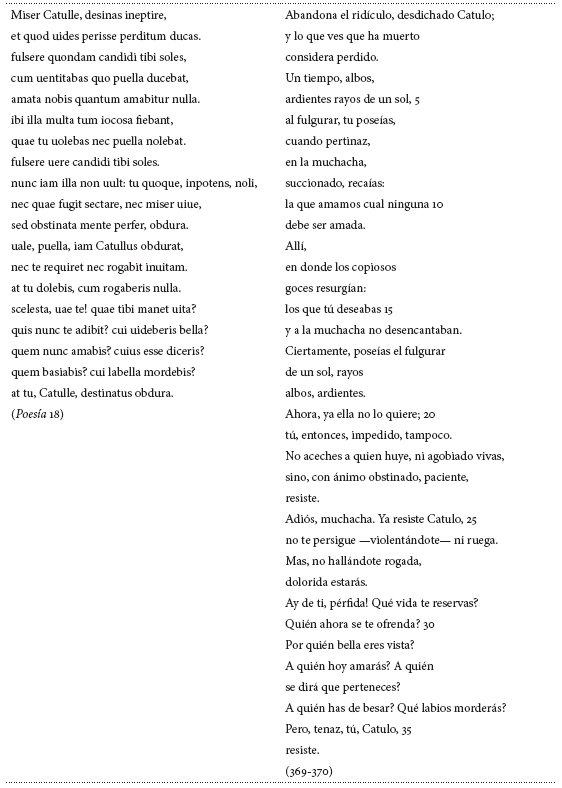 En la primera estrofa de la versión de Oliva, el verso 12 tiene una sola palabra: Allí. Este procedimiento es común en el autor y remite a la referencia textual de los deícticos.16 La segunda, en cambio, tiene dos versos que repiten una misma y única palabra: resiste (versos 24 y 36). Esta palabra da el tono a la estrofa y al poema en su totalidad. Resiste traduce el latín obdura, que aparece al final de los versos 11 y 19. Galán también propone resiste, aunque en la primera aparición evita la posición de final de verso. Ramírez de Verger elige mantente firme (55-56), al igual que Thorn, be firm (15). La versión de Soler Ruiz, en prosa, prefiere aguanta (70-71). En cualquier caso, queda claro que ninguna versión (y tampoco el original de Catulo) otorga al término la importancia que le da Oliva, al descolgarlo del verso al que pertenecía para hacer de él una unidad por sí mismo.