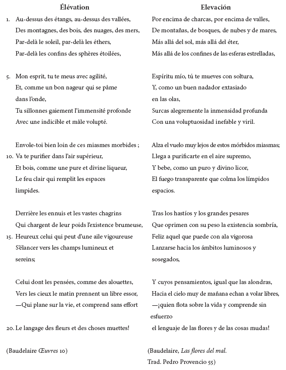 EN EL TERCER POEMA DE "Spleen e ideal", la primera parte de Las flores del mal (1857), el yo poético comienza con una irónica elevación sobre los valles y los estanques, o charcas, de acuerdo con la traducción arriba presentada. Se eleva sobre lo terrenal para ir más allá, al cielo empíreo, superior, trascendental, que busca el espíritu para elevarse místicamente sobre todo lo terreno. Esta imagen fue un tópico importante en el Romanticismo y mucho antes en los filósofos estoicos. Al elevarse el espíritu, la voz poética observa la pequeñez humana y el hombre aprovecha la ocasión para recuperar el lugar que le corresponde en la obra divina.