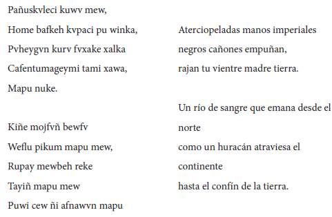 Mientras en castellano las manos del wingka invasor cortan las vísceras de las hijas de la tierra -introduciendo la imagen de una carnicería y de la violación de las mujeres-, la versión en mapudungun acomete a su contraparte castellana con los siguientes versos "kaxuñmapafi ñi puñ mew niel / tvfaci mapu ñi coyvn". Aquí reaparece el verbo cortar con kaxuñ (Augusta 78) pero se incluye una referencia explícita a la hablante lírica como testigo de los hechos violentos con la frase adverbial "ñi puñ mew", "delante mío, frente a mí" (Augusta 189). De esta manera, el poema intercepta un tiempo pasado y lo trae al presente enunciativo del texto poético como algo "más que el registro historiográfico" (Sánchez 32), un tiempo en latencia como memoria que guardan las fuerzas protectoras del Wallmapu y que revive ante los ojos de quien sabe vincular aquellos hechos de sometimiento con los actuales.