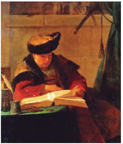 En el ensayo al que me refiero, comentaba ampliamente un capítulo de otro libro de Steiner, Pasión intacta. En ese capítulo, "El lector infrecuente",1 Steiner interpreta un óleo de Jean Siméon Chardin titulado El filósofo leyendo (Le Philosophe lisant), que viene a ser una suerte de bodegón de la lectura erudita (imagen 1). Así como los bodegones disponen su "naturaleza silenciosa", Chardin, que era un pintor de bodegones y de escenas íntimas de un realismo sorprendente para su época, crea una alegoría en la que se pueden encontrar, alrededor de la imagen del filósofo lector, los atributos de la lectura. En ese cuadro del siglo xviii, Steiner halla representada la lectura canónica, la lectura "bien hecha", aquella que el crítico reaccionario que dicen que es, defensor a ultranza de la alta literatura, no duda en considerar desaparecida, muerta, ausente por completo en épocas recientes.