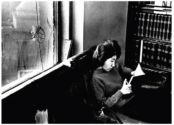 En una de sus fotografías, Kertész retrata a una joven leyendo en una biblioteca en la universidad de Long Island, en 1963 (imagen 2). El sofá sobre el que se reclina tiene los bordes y parte del espaldar con el cuero y el relleno roídos por el uso; la ventana desde donde se filtra la luz está opaca por el polvo; un cable o la cuerda de una cortina, semienrollada, cuelga de manera turbadora sobre el vidrio sucio. Todo parecería conspirar contra la posibilidad de la lectura seria. Al fondo de la foto, en una estantería al alcance de la mano, reposan varios tomos empastados de modo uniforme, probablemente negros, con letras doradas que indican sus títulos, sus autores quizá y sus códigos de catalogación. El libro, pues, ha perdido toda su identidad y ha sido despojado del aura que tenía en el óleo de Chardin.
