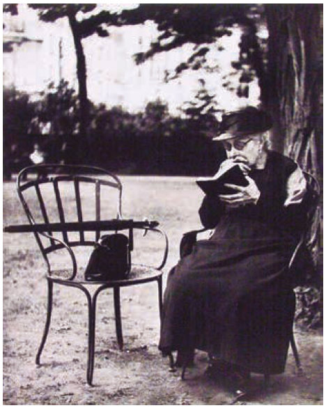La muerte me llama. La lectora de esta fotografía de Lisette Model es una mujer mayor, a quien la muerte llamará pronto. Apartada de la gente, en medio de un terreno estéril del bosque de Boulogne, de espaldas al tronco grueso de un árbol que le da sombra pero que a la vez debe ser el causante de que la tierra esté seca a su alrededor, la anciana está absorta en su lectura. Quizá insiste en una lectura del tipo que Chartier y Cavallo llamaron "intensiva": aquella que se hace -se hacía- una y otra vez del mismo libro, como la lectura de la Biblia por los cristianos o la del Corán por los musulmanes.