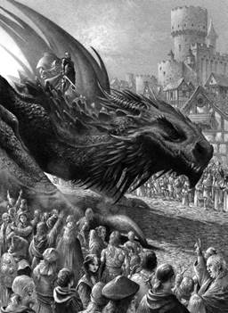 El autor estadounidense George R. R. Martin, en su serie Canción de hielo y fuego, también le da a sus dragones, además de dos patas traseras y dos alas usadas como patas delanteras, una serie de rasgos físicos particulares. Por ejemplo: "Las escamas de dragón son sumamente (aunque no completamente) ignífugas" (Martin, Fuego y sangre 653). Los dragones están ligados a la Casa Targaryen (emblema: dragón tricéfalo), cuyos miembros los utilizaban en batalla mucho antes de los eventos de la saga (ver imagen 11). Al final de Juego de tronos, Daenerys Targaryen, viuda de catorce años e hija exiliada del último rey Targaryen en Poniente, se convierte en figura materna de tres dragones recién nacidos (765), y pasa a ser llamada Madre de Dragones. Los dragones, llamados Drogon, Rhaegal y Viserion, acompañan a Daenerys en su búsqueda de conquistar los Siete Reinos de Poniente, antes gobernados por su familia, utilizándolos para liberar un ejército de esclavos, quienes pasan a sus filas, quemando a sus antiguos amos (Martin, Tormenta 385-386). Este personaje, por lo tanto, rompe con el estereotipo de la mujer como enemiga, víctima o prisionera del dragón en la literatura, lo que contrasta con los demás personajes femeninos que se han mencionado en este artículo.