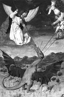 Para el hombre medieval los animales fabulosos son imágenes del diablo, como es el caso del dragón y el basilisco, "el mundo animal es, sobre todo, el universo del mal" (Le Goff 299). Esta idea fue difundida por los bestiarios a partir del Fisiólogo, pero su principal inspiración, para el caso del dragón, fue la Biblia. En este libro, el diablo solamente aparece en forma de dragón, imaginado todavía como una serpiente al comienzo de la era cristiana, en el libro del Apocalipsis (a finales del siglo i d. C., aproximadamente),14 esta es la base más importante para la visión de este monstruo como imagen del mal en Occidente. La Biblia describe, entre muchas otras figuras, a una mujer embarazada "vestida del sol, con la luna debajo de sus pies y sobre su cabeza una corona de doce estrellas" (Apoc. 12:1) y "un gran dragón escarlata que tenía siete cabezas y diez cuernos, y en sus cabezas tenía siete diademas" (Apoc. 12:3). También se menciona una guerra en el cielo entre los ángeles liderados por Miguel y los ángeles rebeldes que se unieron al dragón, "la serpiente antigua, que se llama Diablo y Satanás" (Apoc. 12:7-9) (ver imagen 3). Estos últimos caen derrotados. El Apocalipsis puede verse como otra imagen de la antítesis del régimen diurno, en el que se identifica a lo puro y la sombra con la salvación (Jesús) y el pecado (Satán), respectivamente. El significado del dragón radica en la concepción del diablo dentro de los textos neotestamentarios.15 En estos textos, el diablo "opera como un contraprincipio de Cristo. El mensaje central del Nuevo Testamento es la salvación: Cristo nos salva. Y nos salva del poder del diablo. Si se descarta el poder del diablo, la misión salvadora de Cristo pierde sentido" (Burton et al. 230).