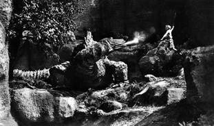 En El Silmarillion, poco después de la creación del mundo (Arda), Melkor, el más poderoso de los Valar, la categoría más alta entre los ainur (espíritus comparables con los ángeles), se rebela contra Ilúvatar, el dios único y creador, debido a su soberbia y envidia hacia este. Con el objetivo de gobernar y remodelar el mundo, Melkor, primer Señor Oscuro y luego llamado Morgoth, toma forma física y emprende varias guerras contra los humanos, elfos y enanos que durarán siglos, apoyado por otros ainur corrompidos, especialmente su lugarteniente Sauron, y varios monstruos nacidos de su poder (alterando lo existente), incluyendo los dragones, su arma más poderosa. En una de estas guerras, desde las profundidades de Angband, la gran ciudadela de Morgoth, surge Glaurung, padre de los dragones,32 llamado Glórund en los primeros escritos de Tolkien, que era un urulóki sin alas y con cuatro patas (ver imagen 9).33 Ilúvatar es una especie de representación del dios cristiano, mientras que Morgoth se asemeja al ángel rebelde Lucifer-Satán. El dragón es una forma del diablo en la Biblia, pero los dragones de Tolkien están estrechamente vinculados con Morgoth, el origen de muchos de los males en la Tierra Media, aunque no de todo el mal (Carpenter, Cartas 431).