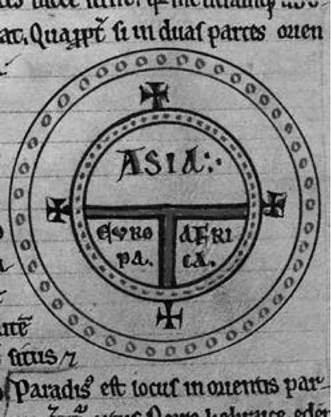 No obstante, me interesa Cascales por otra razón: el anhelo de perpetuación de la división tripartita de la poética medieval que se corresponde a la división teológica estamental de lo social que, al menos hasta 1492 en Europa, se ve repartida en tres continentes, África, Asia y Europa. Esta división es fácilmente identificable en el conocido Mapa t de las Etimologías de Isidoro de Sevilla, trazado en la primera mitad del siglo 7 de la era cristiana (ver figura 1):