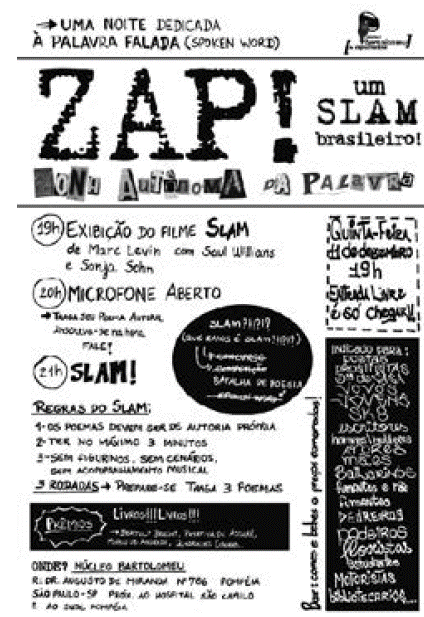En Brasil, el formato de los slam poetry fue introducido por la poeta y slammer Roberta Estrela D'Alva, que en 2008 organizó el primer slam del colectivo ! - Zona Autónoma da Palavra (ZAP!), en São Paulo (ver figura 1).