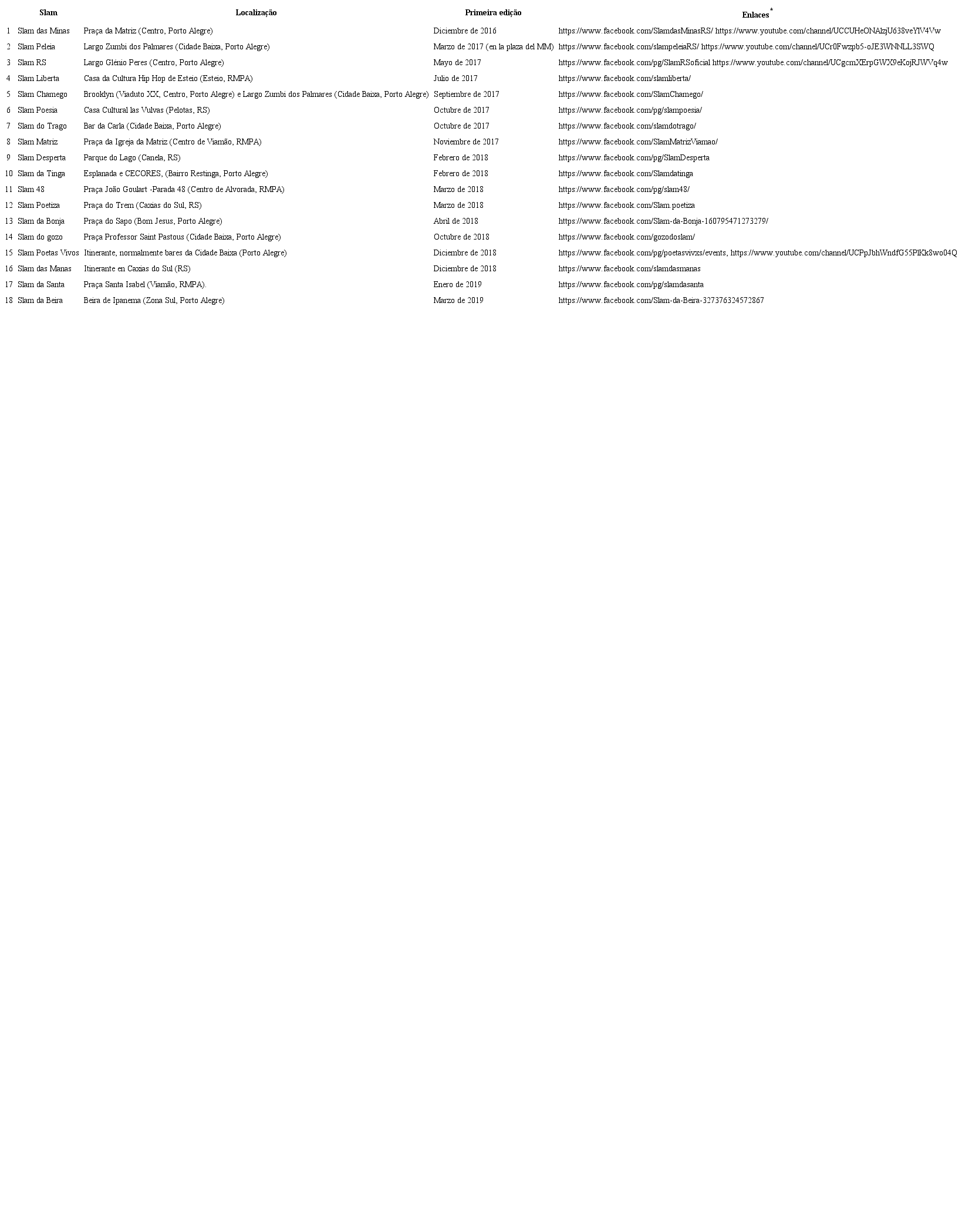 La explosión de los slams en Porto Alegre y su región metropolitana se puede apreciar en la cantidad de slams actualmente en funcionamiento. Cada uno de ellos, con al menos cinco ediciones al año, escoge a un vencedor anual para participar en la Final Regional de Slam de Rio Grande do Sul, donde serán escogidos dos participantes para la Final Nacional en São Paulo. En la tabla siguiente (ver tabla 2) registramos los slams actualmente en funcionamiento en el estado. Aunque nuestro levantamiento recoge alguno más que el SLAM BR (dieciocho en lugar de catorce), incluyendo algunos que no se consolidaron o no llegaron a entrar en contacto con la red nacional de Slams, siempre existe el riesgo de omisión por olvido o desconocimiento.
