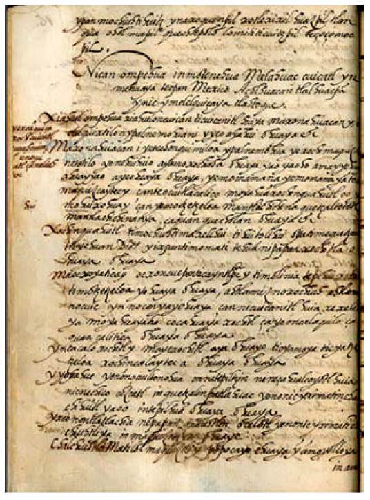 Nican ompehua in motenehua melahuac cuicatl yn mehuaya tecpan Mexico Acolhuacan Tlahuacpan ynic ymelel quicaya tlahtoque