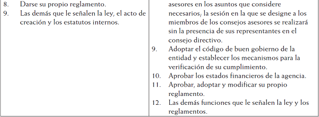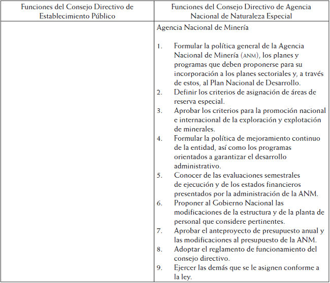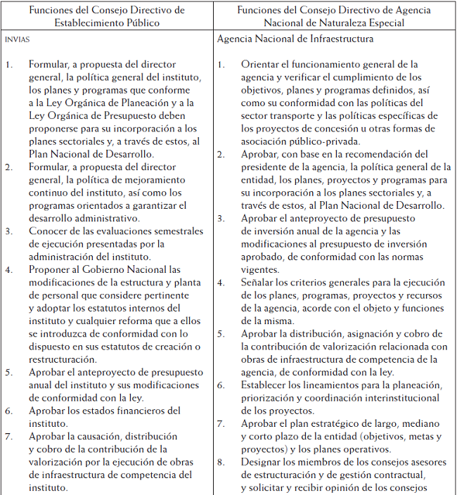 Además, las funciones de los consejos directivos de las agencias de naturaleza especial se asemejan a las de los establecimientos públicos, en lo relacionado con la orientación, política general y funcionamiento de la entidad, aprobación del anteproyecto de presupuesto y sus modificaciones, aprobación de planes y políticas para su incorporación a los planes sectoriales y, a través de estos, al Plan Nacional de Desarrollo, aprobación de los estados financieros de la entidad, proposición al Gobierno Nacional de las modificaciones de la estructura y de la planta de personal que consideren pertinentes, y darse sus propios reglamentos, como se ilustra a continuación en el cuadro que compara al Instituto Nacional de Vías (INVIAS), establecimiento público, con la Agencia Nacional de Infraestructura y con la Agencia Nacional de Minería, agencias estatales de naturaleza especial.