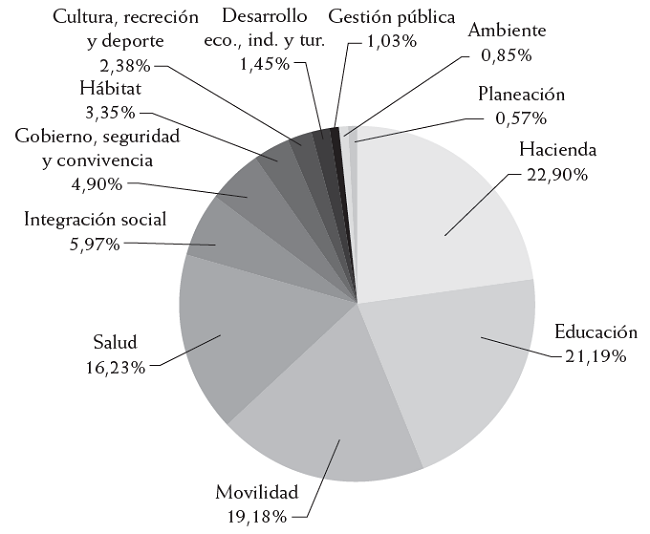 La asignación presupuestal para esos sectores en el año 2011, según el Decreto 532 de 2010, se distribuyó de la siguiente manera: el sector con mayores recursos fue el de hacienda, $2.781.232.401.000, que corresponde al 22,9% del presupuesto; luego educación, $2.573.219.496.000, con un 21,19%; posteriormente movilidad, $2.328.415.365.000, que es el 19,18%; el cuarto sector con más recursos fue salud, $1.970.597.796.000, es decir, un 16,23%; seguido por integración social, $724.491.178.000, que es 5,97%; en sexto lugar se ubica el sector de gobierno, seguridad y convivencia, $595.477.128.000, es decir un 4,9% del presupuesto distrital; después lo correspondiente a hábitat, $406.449.921.000 con un 3,35%; posteriormente, cultura, recreación y deporte, $289.365.355.000, que corresponde al 2,38%; luego, desarrollo económico, industria y turismo, $176.412.496.000, así como el 1,45% del presupuesto, y en última posición se ubican, gestión pública, $125.033.727.000, que es el 1,03%, ambiente con $102.697.744.000, que corresponde al 0,85% y planeación, $69.103.538.000, con un 0,57% del presupuesto distrital. La distribución de la asignación presupuestal por sectores correspondientes al año 2011 se ilustra en lafigura 1.