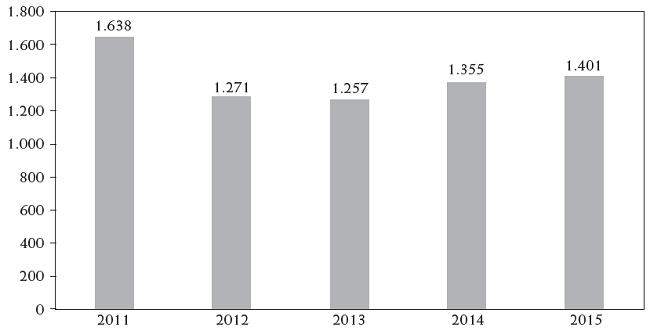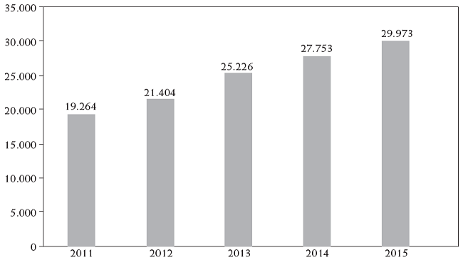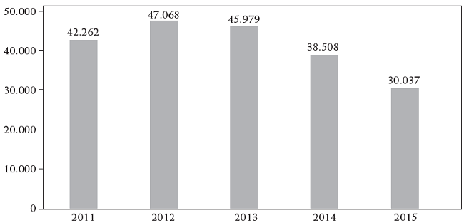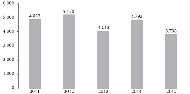 Las cifras presentadas a continuación van de 2011 a 2015 porque los informes del Observatorio de Seguridad de la Cámara de Comercio de Bogotá35, que son la fuente de información a utilizar, aún no ha publicado el documento correspondiente al año 2016. Se prefirió, por tanto, sustraer dicha información antes de afectar la muestra con datos de otra fuente cuya metodología de investigación hubiera sido distinta y por tanto la muestra hubiera podido tener algún tipo de sesgo.