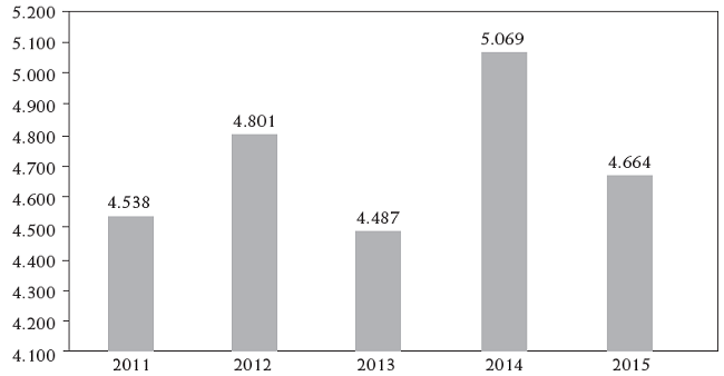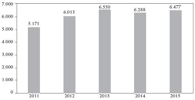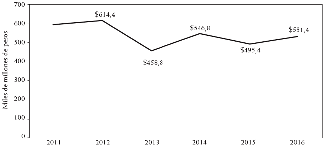 Ahora bien, lafigura 7muestra el comportamiento de la asignación presupuestal destinada al sector gobierno, seguridad y convivencia en el periodo comprendido entre los años 2011 y 2016: