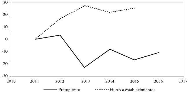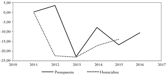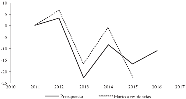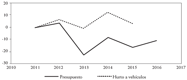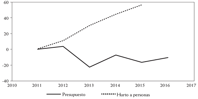 Para el caso en análisis, tanto el gasto público como los delitos (homicidios, lesiones personales y el hurto a las personas, establecimientos, residencias y vehículos) han sido planteados en términos de porcentaje para facilitar la comprensión de la gráfica, donde el punto 0 corresponde al año 2011, para así poder determinar si ciertamente el comportamiento de las dos variables es antagónico en la misma proporción. Por ejemplo, que si la inversión crece en un 5%, los delitos deberían disminuir en un 5%, en el periodo 2011 - 201642(figuras 14-19).