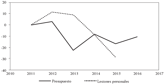 En contraste, en los delitos contra la vida (figura 14), los homicidios caen de manera contundente para el año 2012 y desde entonces empieza un incremento constante. En lo correspondiente a las lesiones personales, lafigura 15muestra que a diferencia del comportamiento del presupuesto, los delitos aumentan para el año 2012 y, posteriormente, inician una tendencia a la baja.