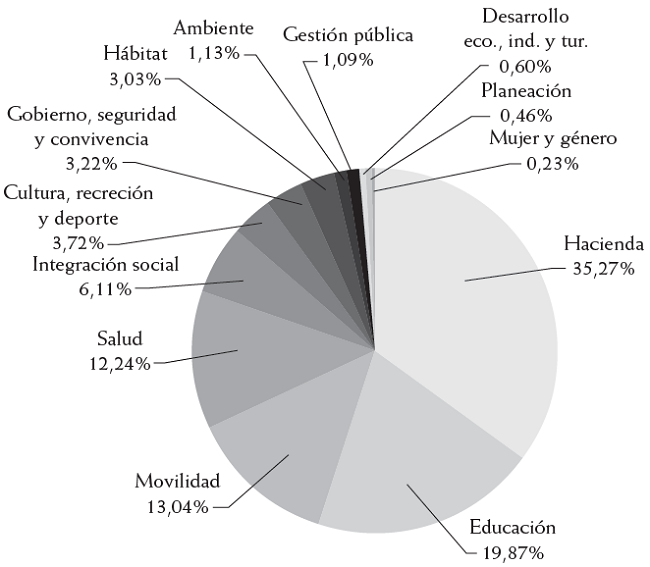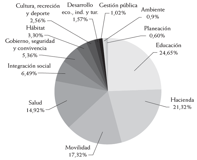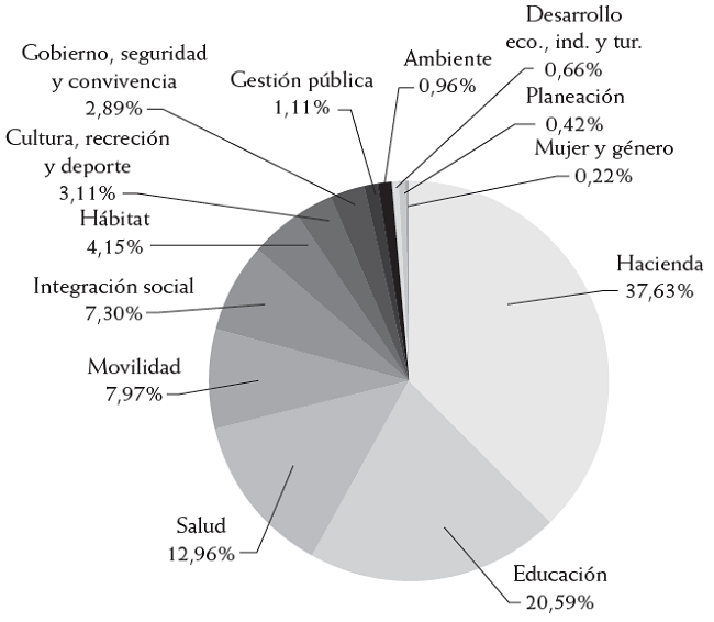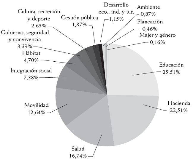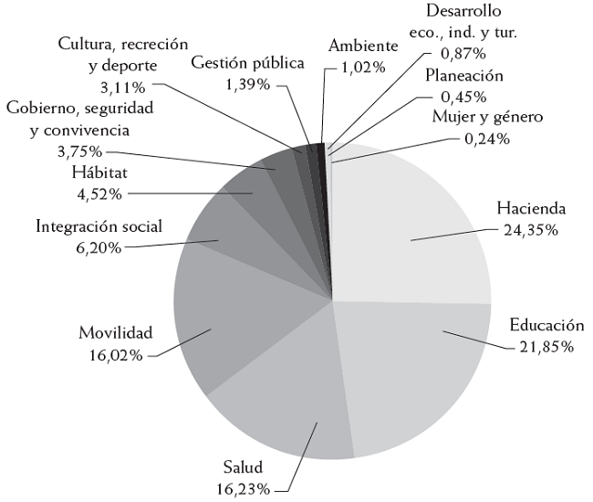 Bogotá compone su presupuesto en trece sectores30así: gestión pública; gobierno, seguridad y convivencia; hacienda; planeación; desarrollo económico, industria y turismo; educación; salud; integración social; cultura, recreación y deporte; ambiente; movilidad; hábitat; y mujer y género (incluido a partir de 2013), más lo que corresponde a otras entidades distritales como la Personería, la Contraloría, la Veeduría y el Concejo de Bogotá.