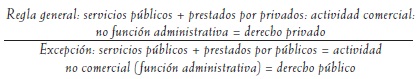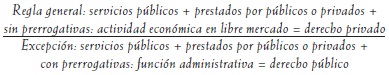 Dentro de las consecuencias más notables de este modelo se encuentra la del régimen jurídico de la actividad de servicios públicos: el derecho privado. Como se trata de una actividad materialmente económica, desplegada en condiciones de libre mercado, que cualquiera puede desarrollar, no se justifican tratos diferenciados ni prerrogativas por la calidad del prestador. Ahora, cuando no se cumple la lógica argumentativa de esta tesis, es decir, cuando quienes presten servicios públicos no actúan en condiciones de igualdad, sino imponiéndose frente a otros sujetos, en tales casos -se sostiene- sí se ejerce función administrativa y procede un régimen de derecho público.